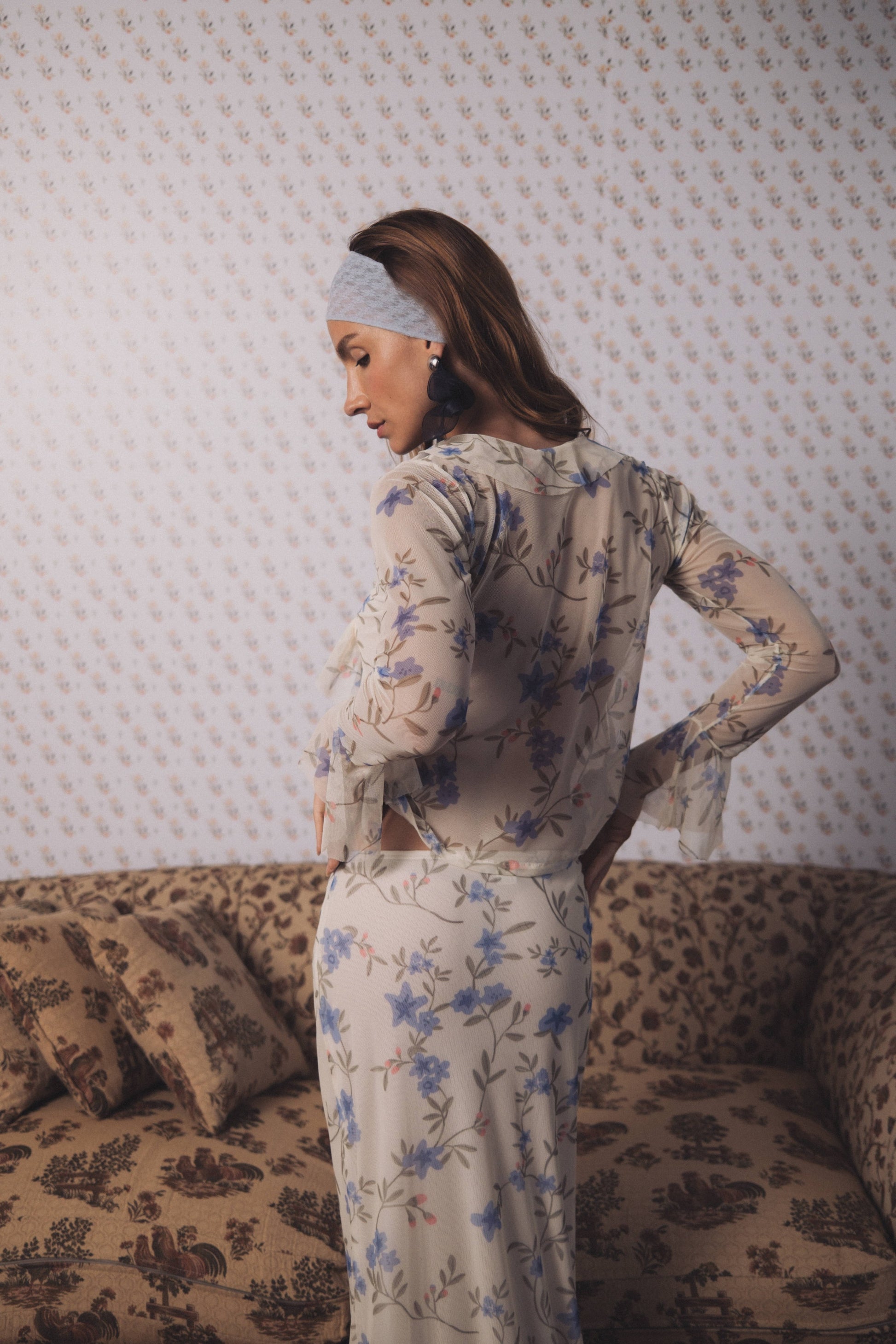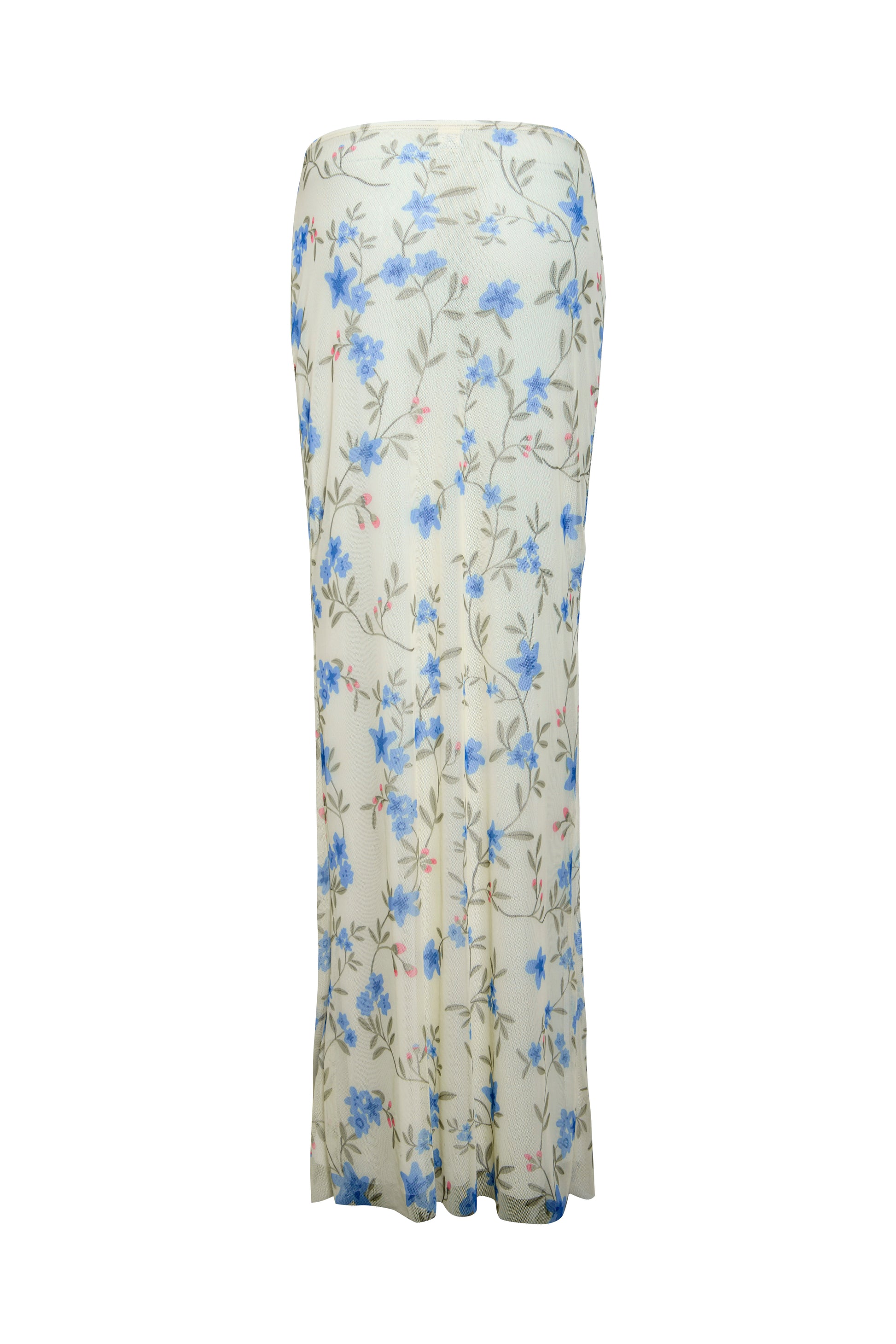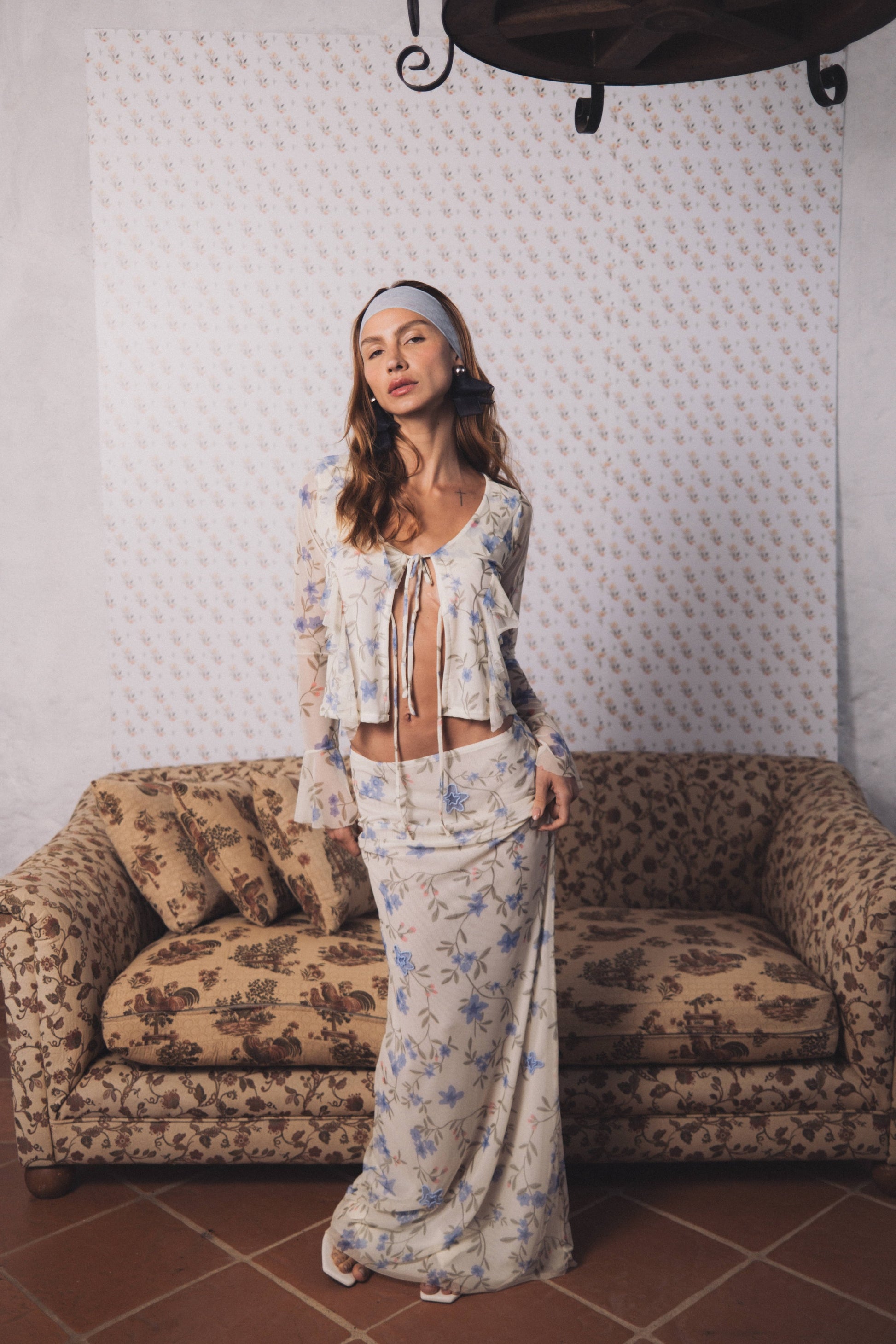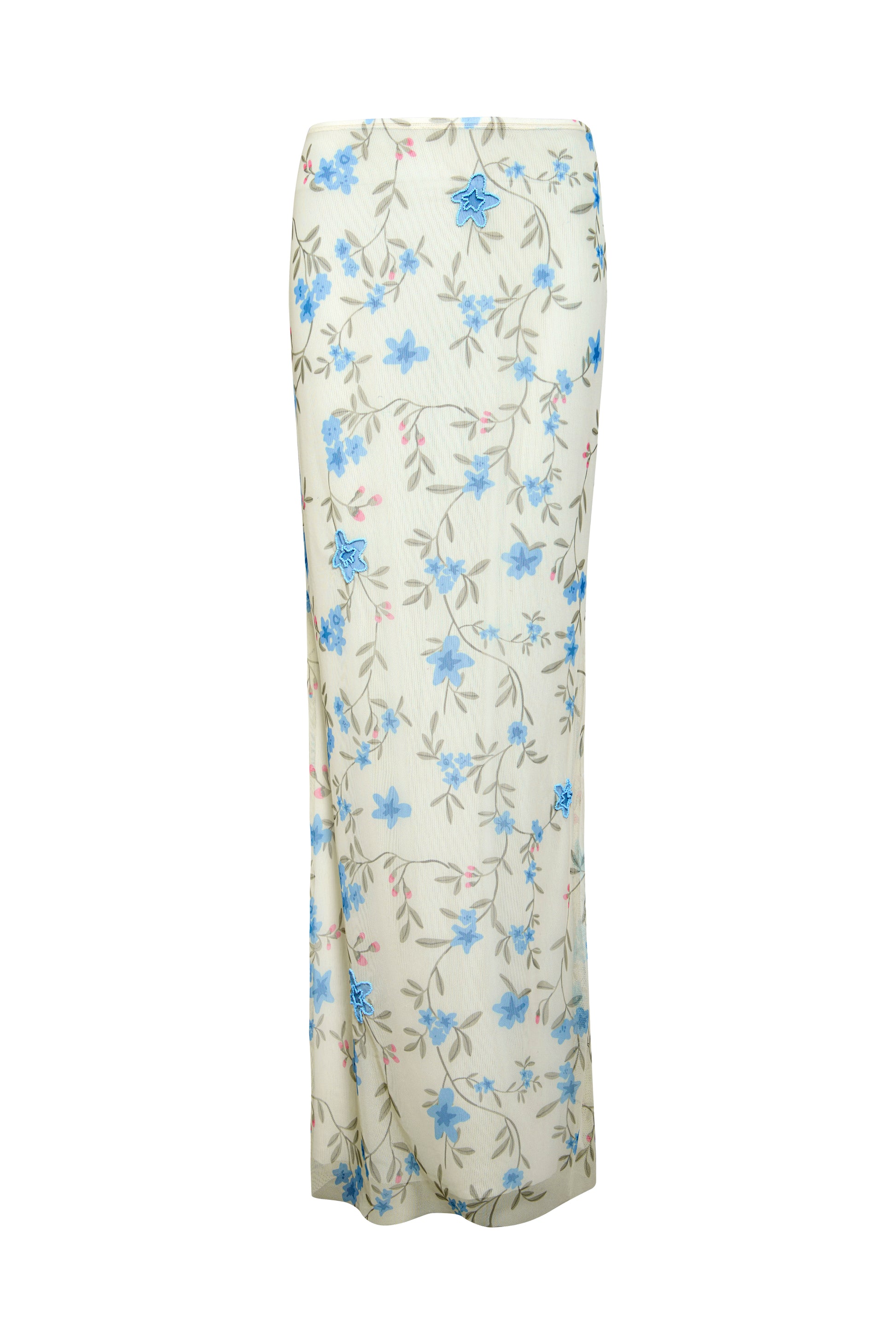Falda de corte recto y diseño ajustado, confeccionada en un tejido suave. Presenta un delicado recamado frontal que aporta textura y contraste, convirtiéndola en una prenda romántica y femenina.