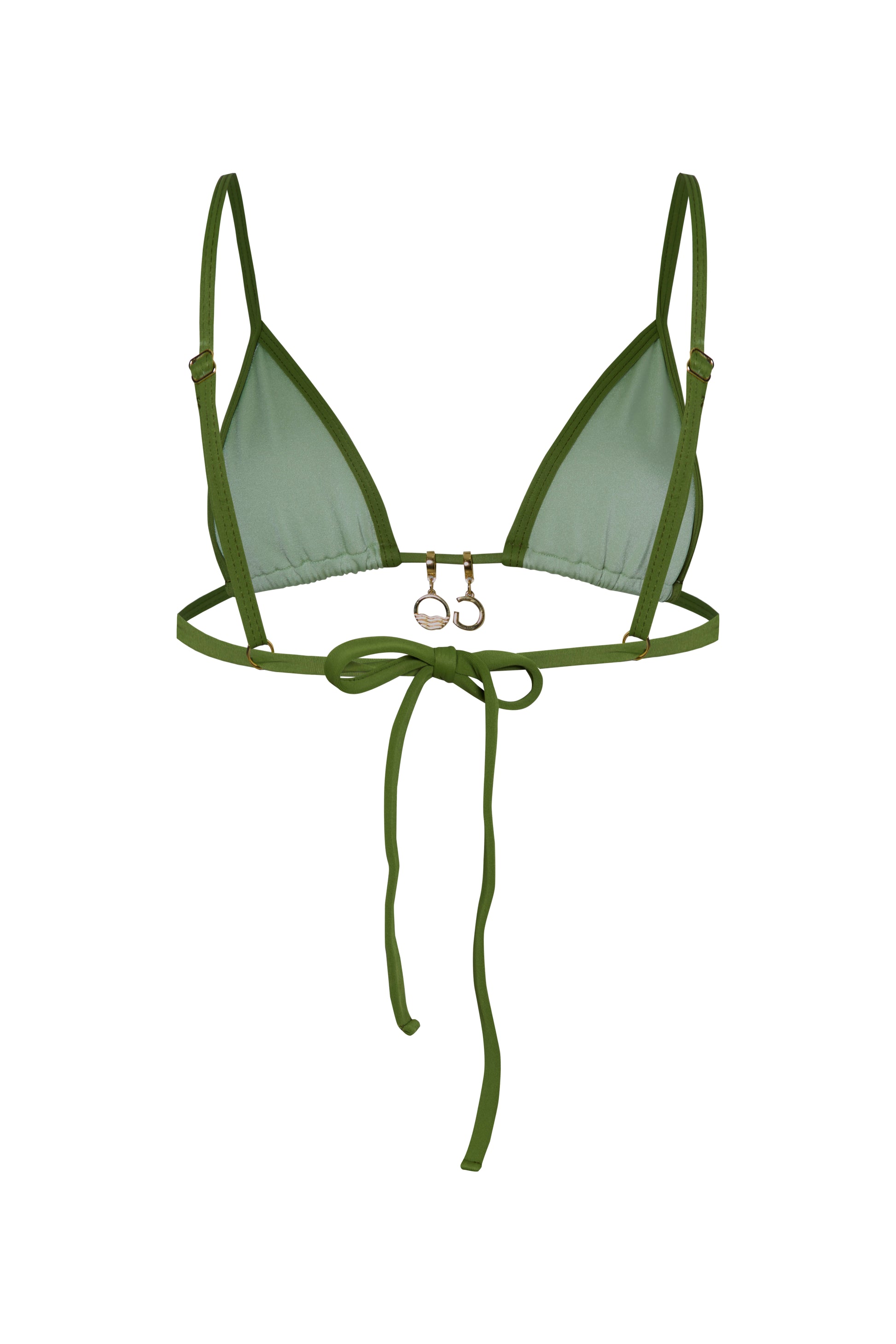 KORA Elegant triangle top with a micro fit. Featuring adjustable shoulder straps, a tie-back closure, and a personalized gold GO charm, it offers both comfort and style in one chic package. Crafted from Italian ECONYL LYCRA and double-lined for extra support without padding.